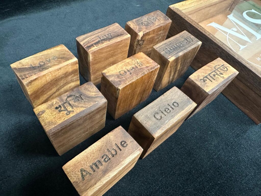 Presenter and actor Jesi Moyano came to us with a special request: to create a personalised wedding gift for her sister, who was marrying her partner of ten years. The couple share three languages—English, Spanish and Bengali—so Jesi wanted a meaningful piece that beautifully represented their cultures.