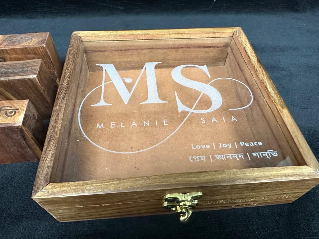 Each small wooden spice box was laser cut with heartfelt words such as love, joy and peace, and the glass lid was laser engraved with the couple’s names.